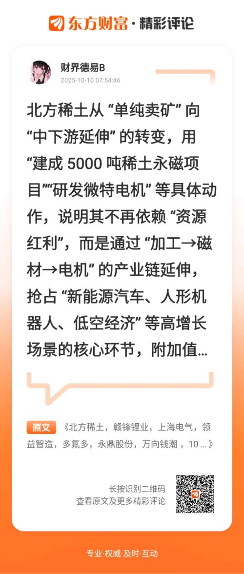//@财界德易B :北方稀土从 “单纯卖矿” 向 “中下游延伸” 的转变,用 “建成 5000 吨稀土永磁项目”“研发微特电机” 等具体动作,说明其不再依赖 “资源红利”,而是通过 “加工→磁材→电机” 的产业链延伸,抢占 “新能源汽车、人形机器人、低空经济” 等高增长场景的核心环节,附加值远超传统业务。$北方稀土(SH600111)$ $万向钱潮(SZ000559)$$上海电气(SH601727)$这老师分析的很棒,跟了几天