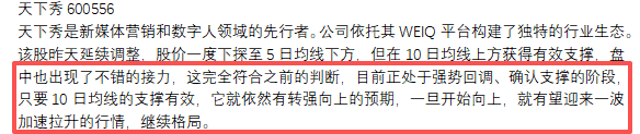 天下秀:新媒体营销和数字人领域的先行者。公司依托其WEIQ平台构建了独特的行业生态。该股今天如期转强向上,表现相当亮眼。在整体大势调整的背景下,走出了独立行情,强势特征非常明显。今天的转强一举反包了前两日的调整,完美符合我们的预期。早盘就判断过,一旦开始向上,有望迎来一波加速拉升行情,继续格局。