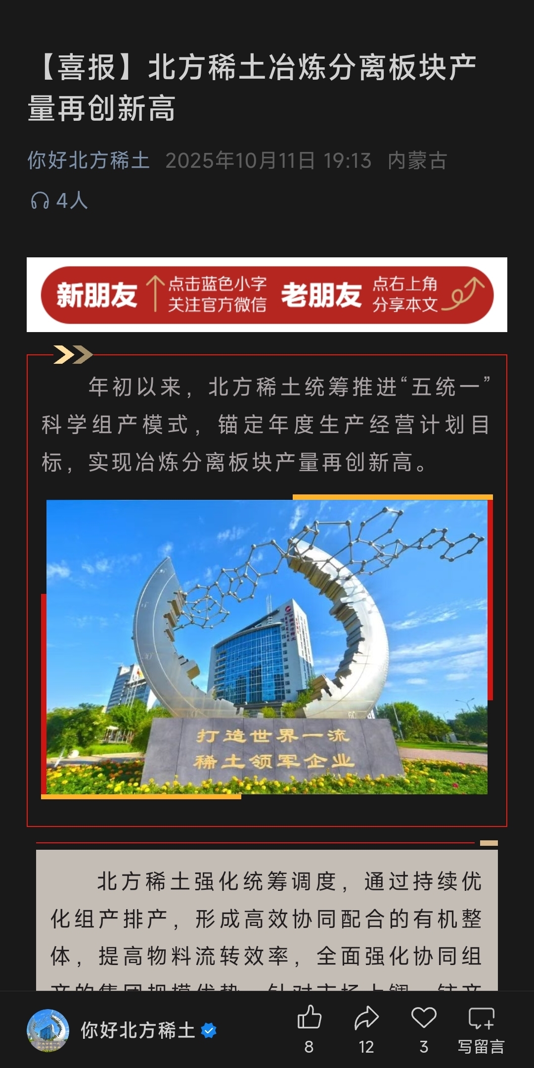 【喜报】北方稀土冶炼分离板块产量再创新高。