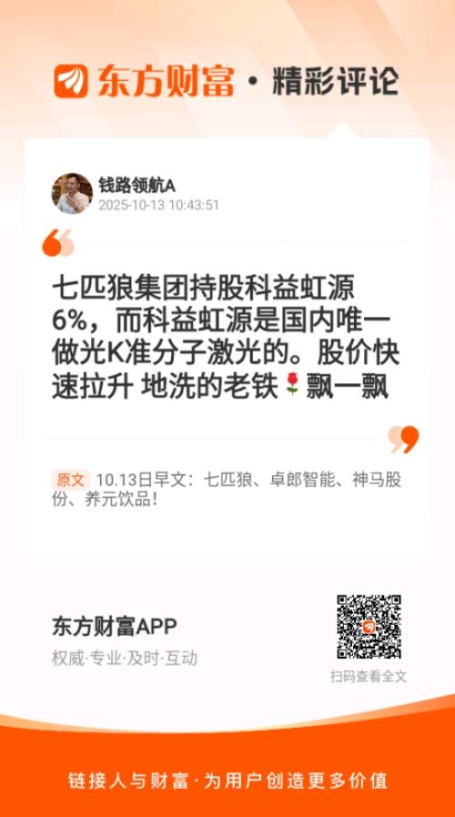 //@钱路领航A :七匹狼集团持股科益虹源 6%,而科益虹源是国内唯一做光K准分子激光的。股价快速拉升 地洗的老铁飘一飘 $北方稀土(SH600111)$$包钢股份(SH600010)$$至纯科技(SH603690)$