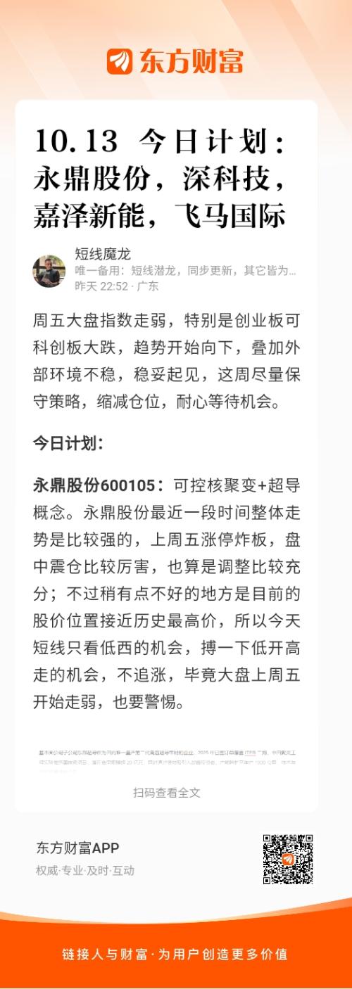 永鼎股份600105:可控核聚变+超导概念。永鼎股份最近一段时间整体走势是比较强的,上周五涨停炸板,盘中震仓比较厉害,也算是调整比较充分;不过稍有点不好的地方是目前的股价位置接近历史最高价,所以今天短线只看低西的机会,搏一下低开高走的机会,不追涨,毕竟大盘上周五开始走弱,也要警惕。