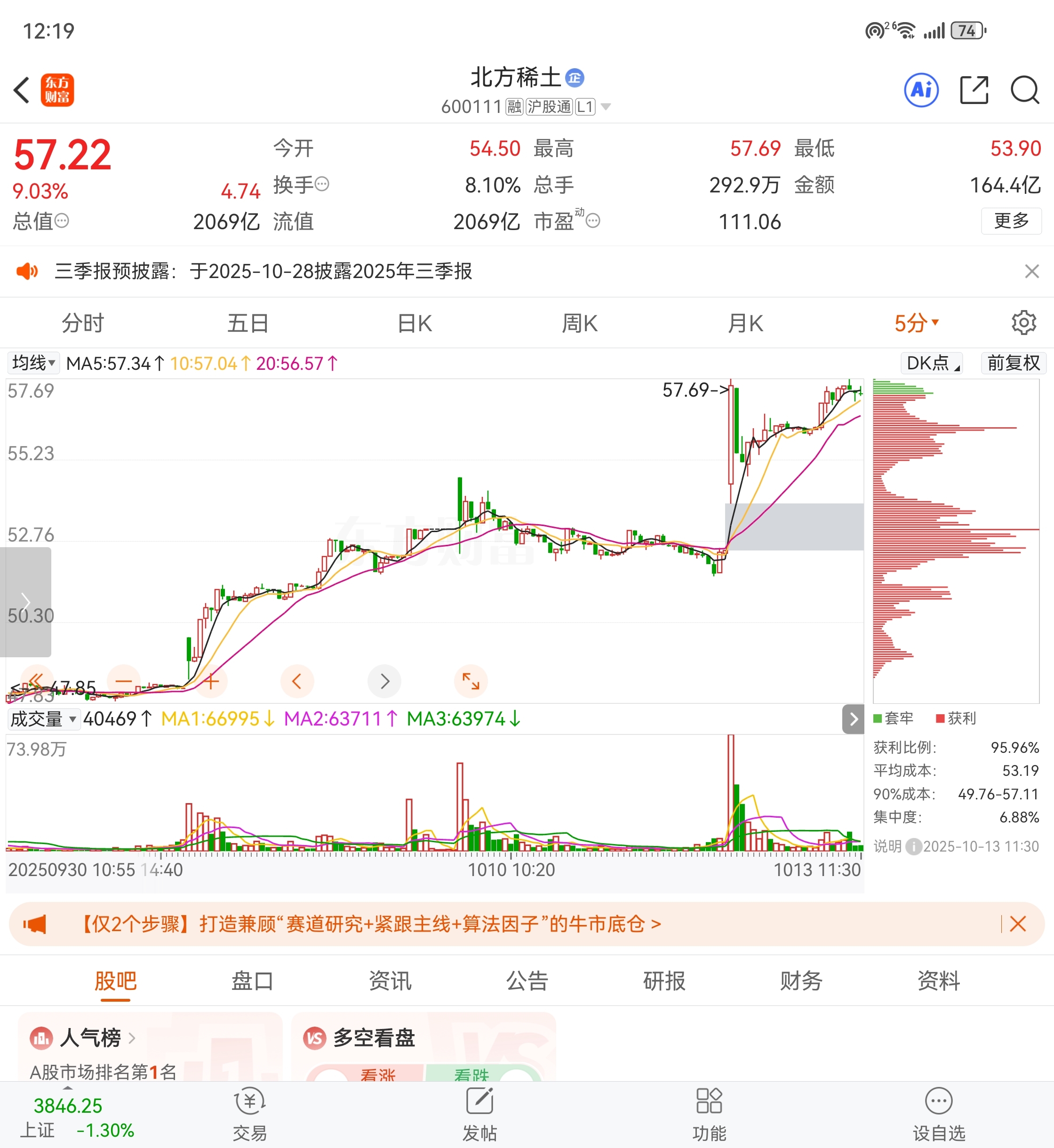 北方稀土继52.3之后,又产生两个防守点55.4,54,