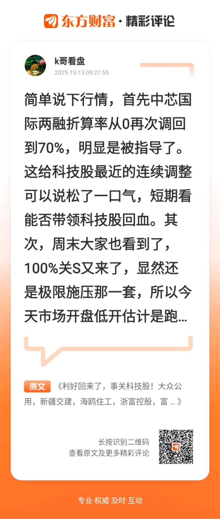 聊完之后,K哥真的是神清气爽,一方面,大佬的观点证明了我之前的判断,第二,对于未来的行情也更加有信心了。当然,我也询问了大佬未来对于热点板块的看法。但是,这块的观点几位大佬意见还是不太统一的。有的认为市场接下来要切换到低位股做轮动,有的认为市场会开始炒作3季报。甚至还有一位大佬依然坚定看多科技股回调之后的抄底机会。所以K哥觉得,既然目前大佬们的观点都不统一,那么这也很可能就是当前市场大资金们的统一认知,混沌阶段。所以我们的操作还是谨慎点,没有坏处。同时,周末七部门也联合发布消息,从消息上看,算力、人工智能等迎利好。这里可以暂时先作为今天的一个观察口,去观察一下市场的反应。说不定国产替代还能起来。