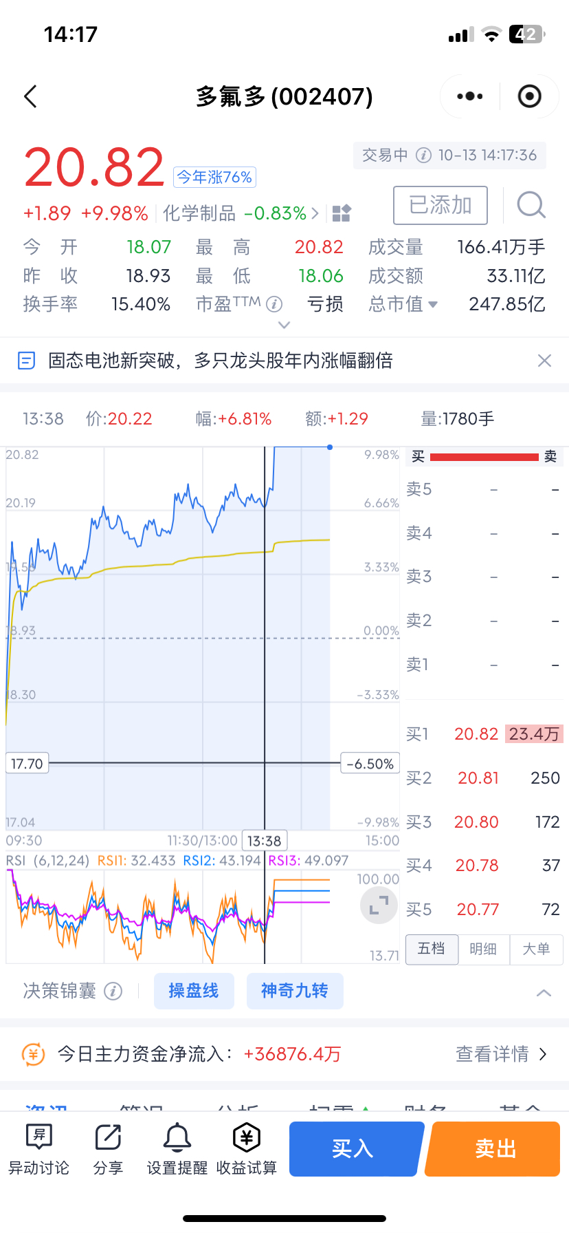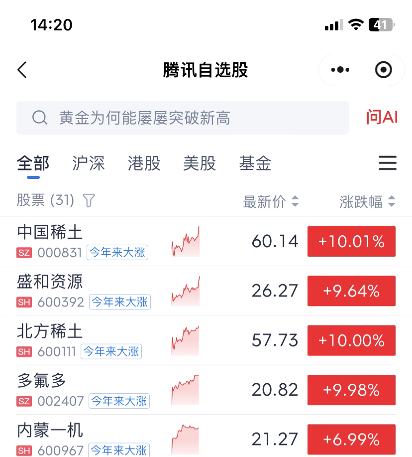 $北方稀土(SH600111)$ 不知道是福还是祸、内蒙一机早上8个点没出、想博他涨停、结果早上临近收盘时看他跟板块指数下来了、6.3个点果断卖出了、下午6.8个加了多氟多自选、本想买入的、刚好去忙了一会、回来一看竞涨停了、最后选择了小金属板块加了三个自选、盛和6.8个点、中国稀土8个点和北方稀土9.7个点、最后果断入了你