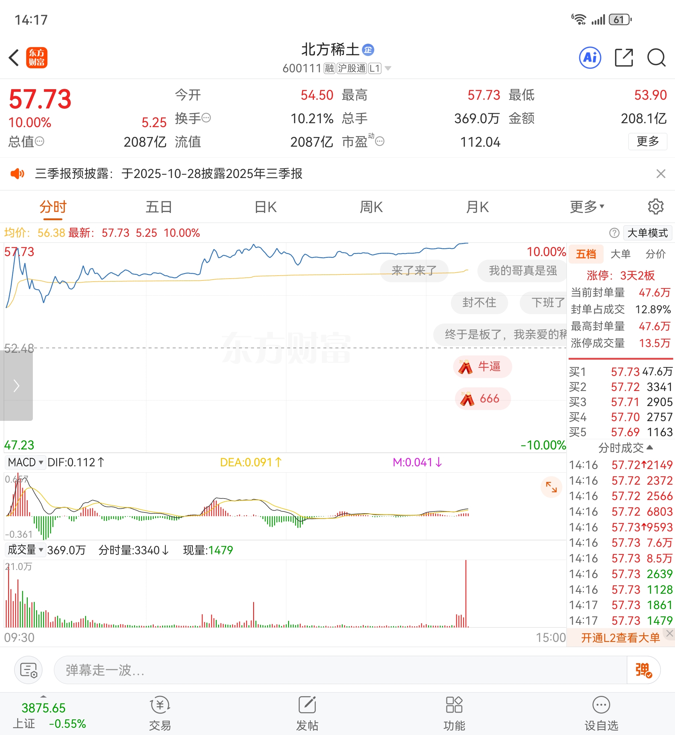 北方稀土作为下游原材料的龙头,强势封板,下游磁材的市场龙头银河收获20cm涨停!恭喜持有的股友!
