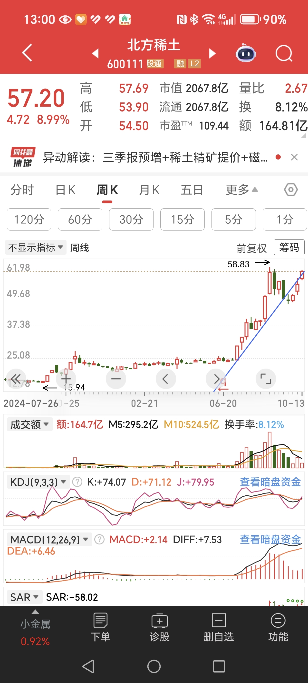 $北方稀土(SH600111)$ $金力永磁(SZ300748)$ $银河磁体(SZ300127)$ #强势机会# 稀土今天的走势非常强势,曾经的老弟银河磁体,今天先涨停,金力永磁紧随其后,北方稀土中流砥柱,上个月,还在墨迹的稀土,仅用三天的时间就已经收复失地,头狼的重仓的金力收益再次回到了高位。