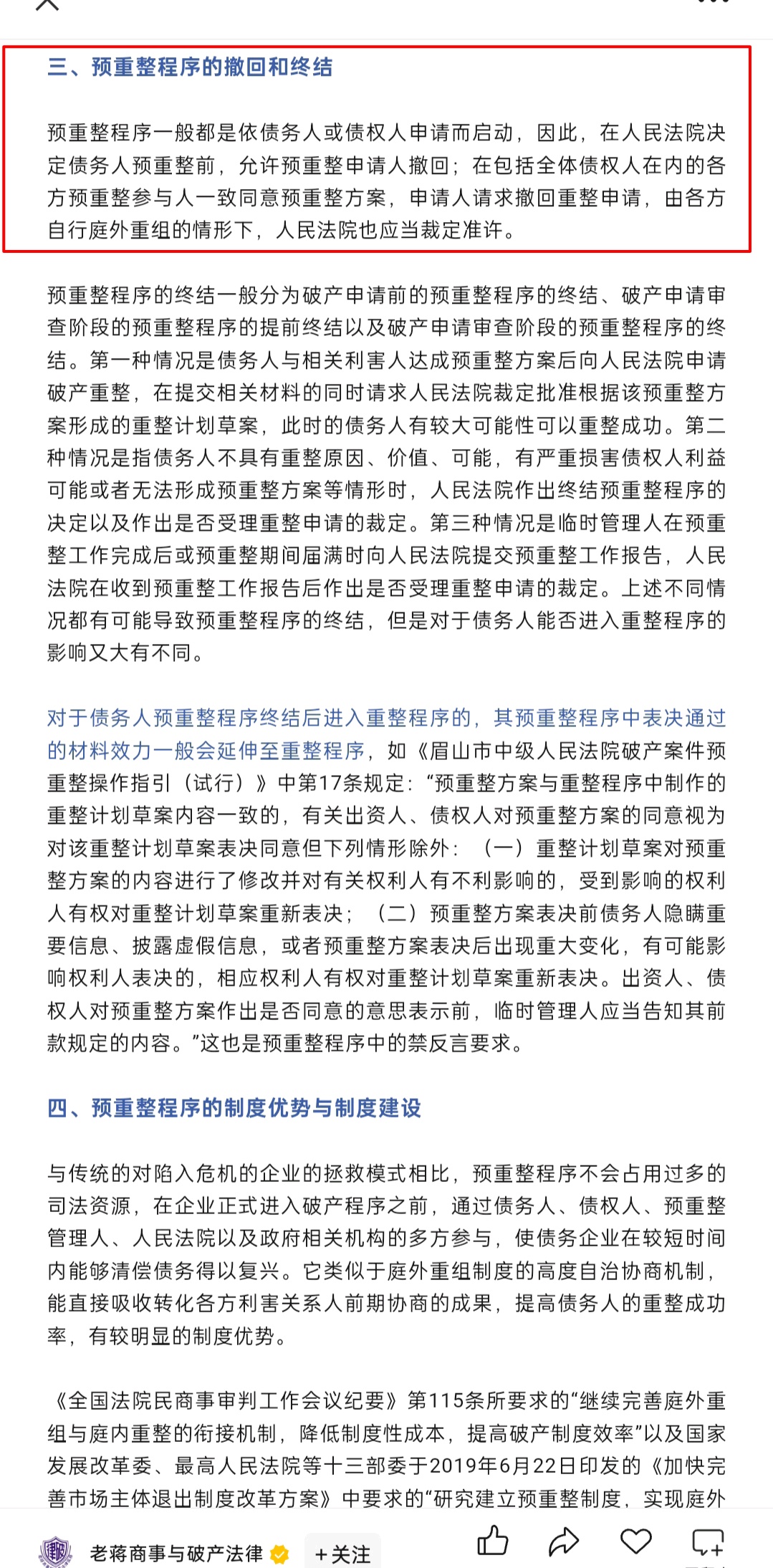 $包钢股份(SH600010)$ $ST香雪(SZ300147)$ $北方长龙(SZ301357)$ 允许预重整申请人撤回:在包括全体债权人在内的各方预重整参与人一致同意预重整方案,申请人请求撤回重整申请,由各方自行庭外重组的情形