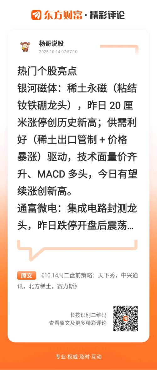 //@杨哥说股 :热门个股亮点银河磁体:稀土永磁(粘结钕铁硼龙头),昨日 20 厘米涨停创历史新高;供需利好(稀土出口管制 + 价格暴涨)驱动,技术面量价齐升、MACD 多头,今日有望续涨创新高。通富微电:集成电路封测龙头,昨日跌停开盘后震荡拉升收涨 3%(振幅 13%),属主力洗盘低吸;暗盘资金大幅流入,重回上升通道,今日值得观察。凯美特气:工业气体龙头(食品级液体二氧化碳领先),上周五涨停、今日快速封板(二连板);缩量上涨显筹码稳定,上涨空间打开,有望破前高创新高。指数表现昨日低开高走收大阳线(3800 点起步),确认前期洗盘效果,消息辟谣加速反弹;市场摆脱调整,今日有望站上 3900 点,开启震荡上行,后期看新高。盘面情绪与板块修复预期升温,科技为主线(光刻机、封装重组、半导体活跃,如华虹公司、通富微电),带动产业链修复。稀土板块(中国稀土、北方稀土)受消息刺激大涨或延续,引领周期板块回暖;贵金属板块稳健上涨提供支撑,今日或开启反弹修复。持仓复盘天下秀(600556):新媒体营销 / 数字人先行者(WEIQ 平台生态),10 日均线支撑后企稳 5 日均线上方(强势调整);AIGC、元宇宙受关注,今日放量破小高点或启新涨,继续格局。赛力斯:华为智选车核心,今日微跌为上升中正常调整;华为问界销量为基本面支撑,新能源汽车板块回暖或重拾升势。江西铜业(600362):铜业龙头,昨日调整属蓄力;国际铜价企稳、国内经济回暖增工业金属需求,今日或结束调整回上升轨道,继续格局。中兴通讯:通信核心(仅次于华为,全球 ICT 解决方案领先),昨日震荡收涨;5G、算力网络为长期战略,沿 5 日均线攀升,今日大概率续涨或创新高。北方稀土(600111):稀土龙头,昨日强势涨停(资金看好利好预期);利好驱动上涨难一日结束,今日大概率续强或冲涨停,继续看多格局。$北方稀土(SH600111)$$湖南黄金(SZ002155)$$天下秀(SH600556)$