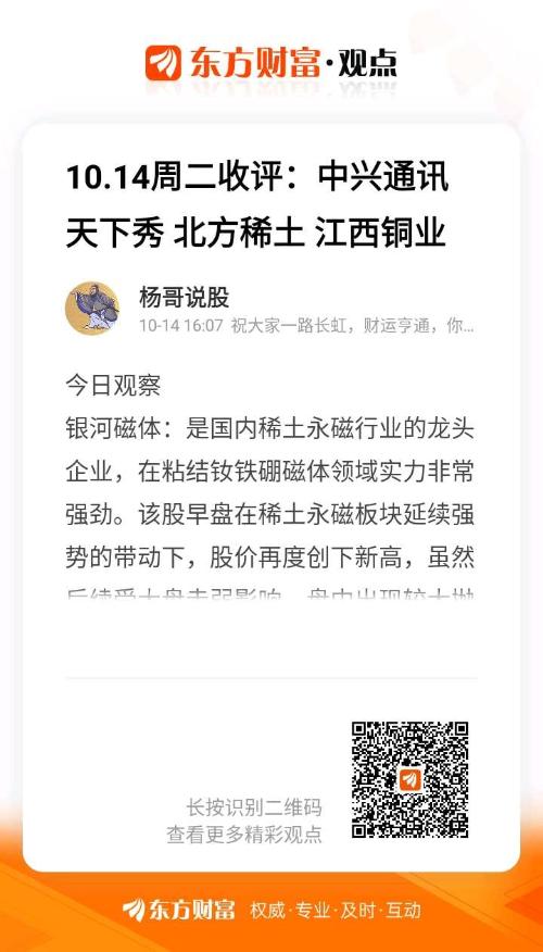 银河磁体:是国内稀土永磁行业的龙头企业,在粘结钕铁硼磁体领域实力非常强劲。该股早盘在稀土永磁板块延续强势的带动下,股价再度创下新高,虽然后续受大盘走弱影响,盘中出现较大抛压导致有所回落,但最终仍维持了不错的涨幅,整体上升趋势并未改变,预计该股有望在当前位置企稳,重拾升势,继续向上拓展空间。值得继续观察。