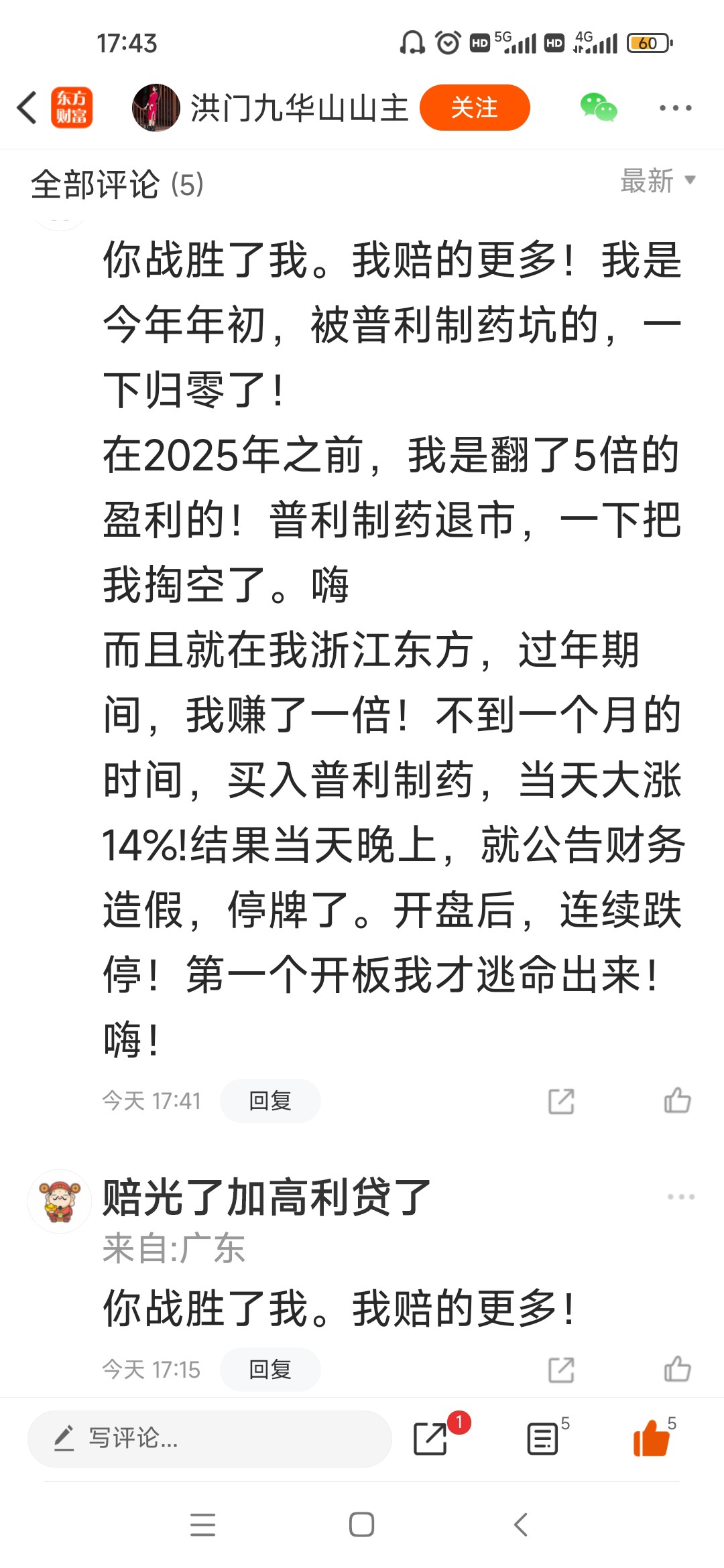 你战胜了我。我赔的更多!我是今年年初,被普利制药坑的,一下归零了!在2025年之前,我是翻了5倍的盈利的!普利制药退市,一下把我掏空了。嗨