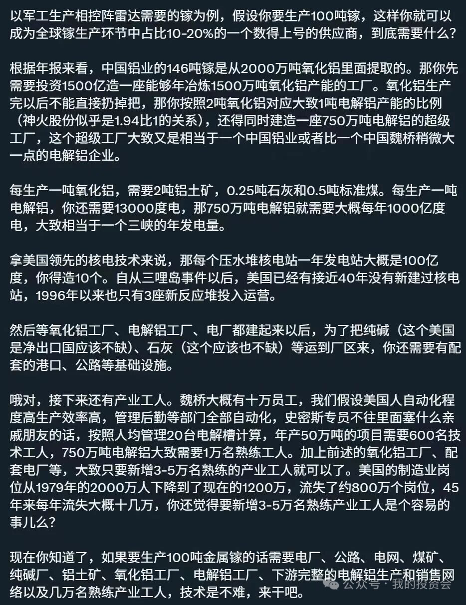 根据年报来看,中国铝业的146吨镓是从2000万吨氧化铝里面提取的。那你先需要投资1500亿造一座能够年冶炼1500万吨氧化铝产能的工厂。氧化铝生产完以后不能直接扔掉把,那你按照2吨氧化铝对应大致1吨电解铝产能的比例(神火股份似乎是1.94比1的关系),还得同时建造一座750万吨电解铝的超级工厂,这个超级工厂大致又是相当于一个中国铝业或者比一个中国魏桥稍微大一点的电解铝企业。
