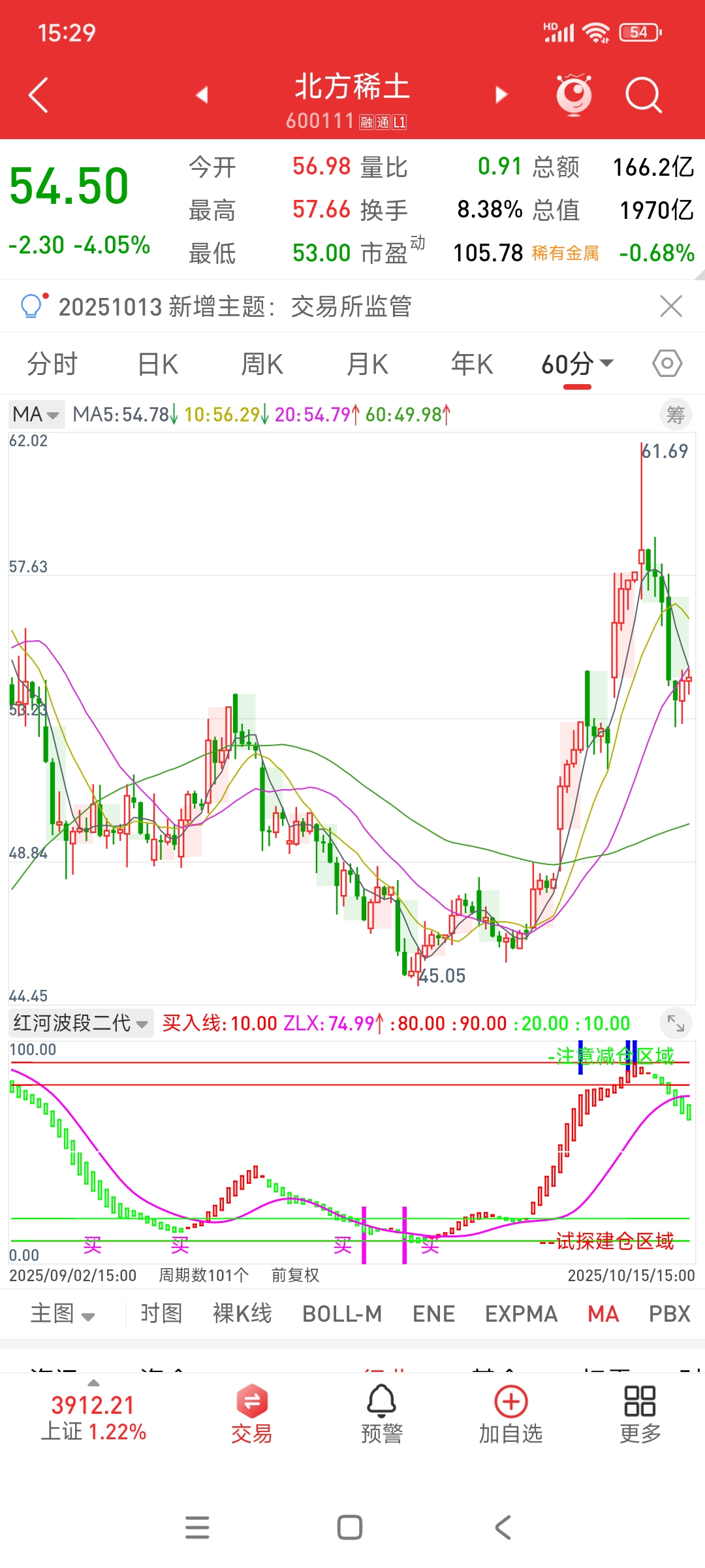 $北方稀土(SH600111)$ 昨天旗帜鲜明的说了稀土减仓了,加仓做t的部分快30个点。现在事后看是不是减在高点了?为什么我说要减仓,因为一小时级别在顶部出现了红柱转绿柱的情况,所以昨天告诉你们我减仓了。目前继续底仓持有,一小时级别出现买字或者绿转红以后继续买回来,成本还是负163,丝毫不慌。