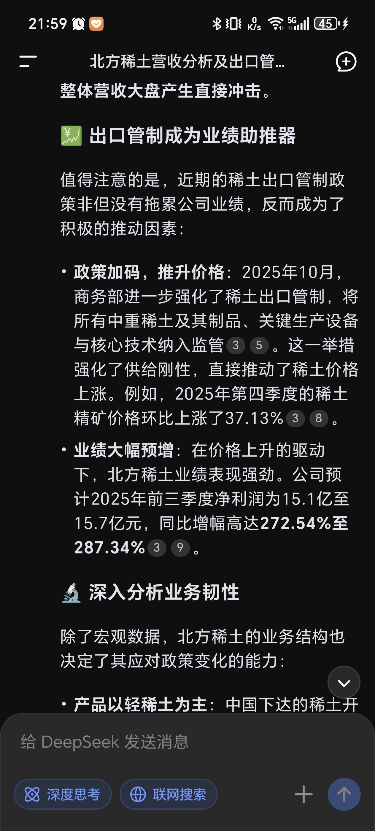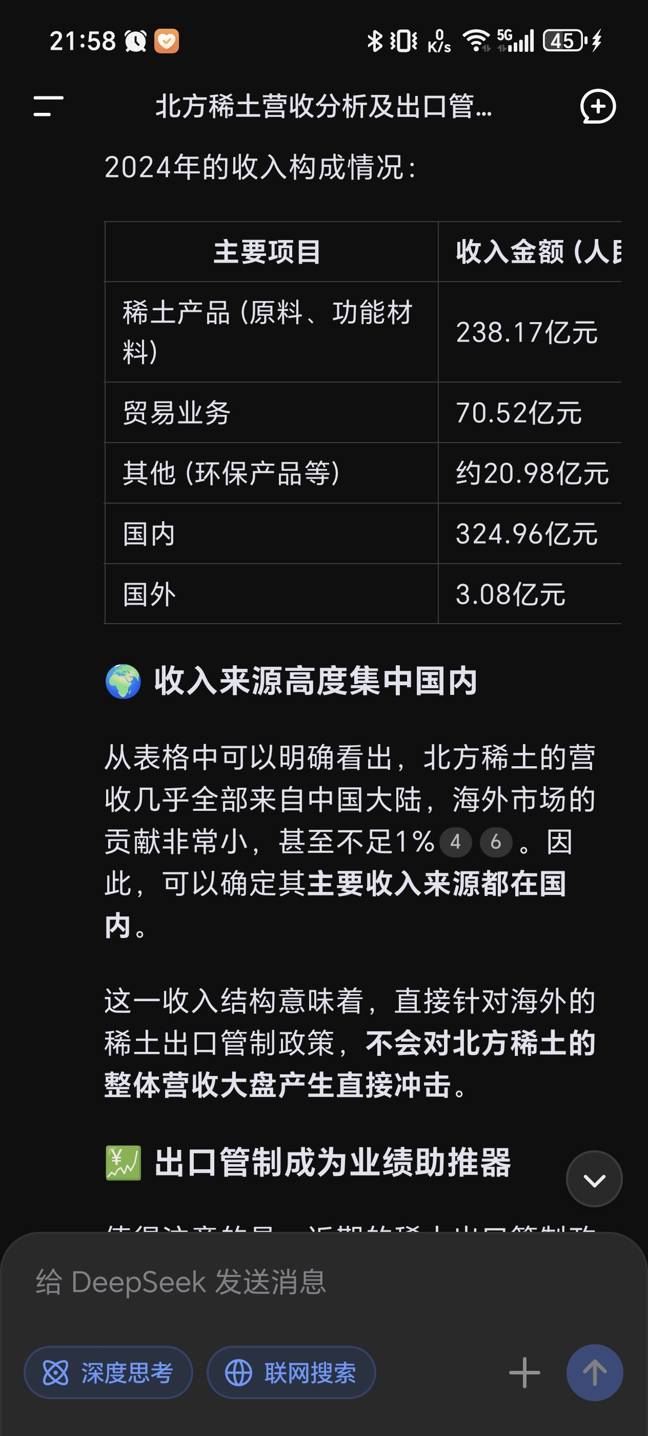 本次稀土管制加强外销稀土原料及技术审批机制,但是北方稀土是生产原料只内销,由国内公司生产成产品磁体或磁体衍生品再进行外销,这种模式一点不受影响,并增加行业海外收入,而且还有原料定价权,产品定价权;这一轮原料涨价带来的就是衍生产品同步涨价;认真解读发现管制只有利好!那些不懂乱说的好好分析下北方稀土的收入构成