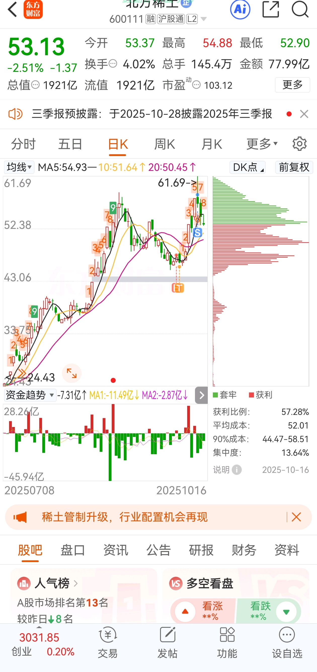 $北方稀土(SH600111)$ 坐等50再回,这一波完美吃肉。