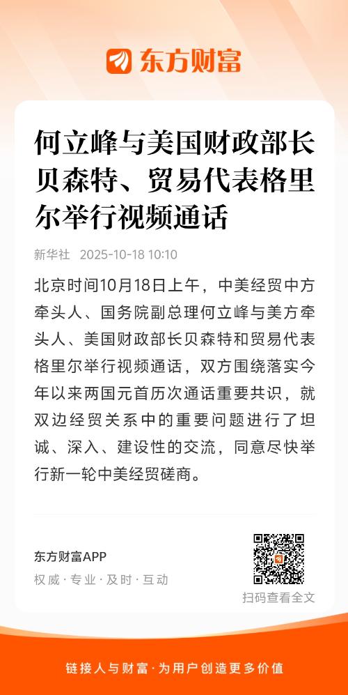 北京时间10月18日上午,中美经贸中方牵头人、国务院副总理何立峰与美方牵头人、美国财政部长贝森特和贸易代表格里尔举行视频通话,双方围绕落实今年以来两国元首历次通话重要共识,就双边经贸关系中的重要问题进行了坦诚、深入、建设性的交流,同意尽快举行新一轮中美经贸磋商。