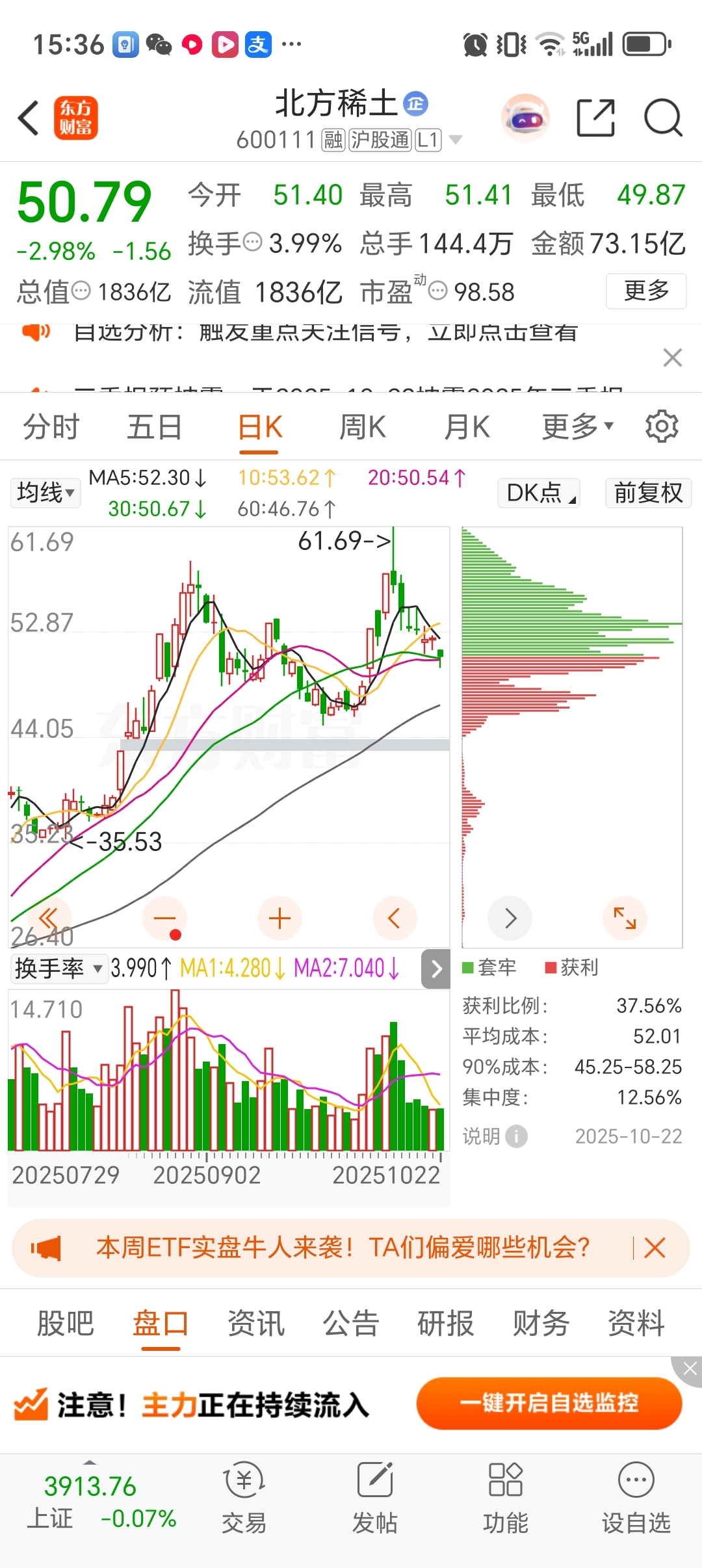 北方稀土今天下杀的有点多,从分时图看开盘就急跌,在最高下杀接近5%之后快速v了上来,然后全天股价几乎在均线上方运行,收跌%2.98。本来昨天发过分析,今天是想偷懒的,因为咱不是做超短线分析的,更不属于荐股带队伍的业务老师,没有必要天天叨叨一遍,既然定调是洗盘阶段,那就在趋势里面放心的呆着,或者高抛低吸的去做低成本就可以了。不过考虑到今天下杀的幅度有点大,怕一些一直看我分析的长线朋友们慌张没有了头绪,所以就出来发一篇,目的就一个,继续为中长线的朋友们鼓舞士气心灵按摩,风浪起时心若定,平风静浪,心稳聚财。