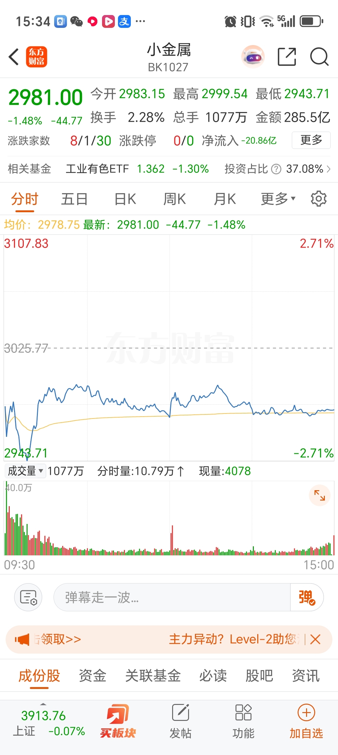 最后还有一个比较有趣的现象,可以看看小金属和稀土永磁的分时图走势,和北方稀土几乎一模一样,这大概说明了,今天有可能有非常大概率是量化工作的一天,主力只是轻微控制幅度和节奏而已,这个我是这么去想的,不一定对哈。