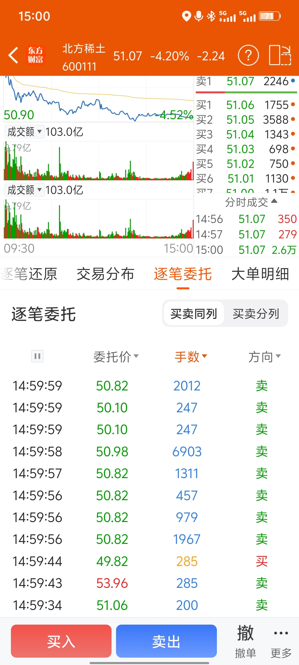$北方稀土(SH600111)$ 今天跟昨天一样,竞价大单苟砸盘,明天也危险