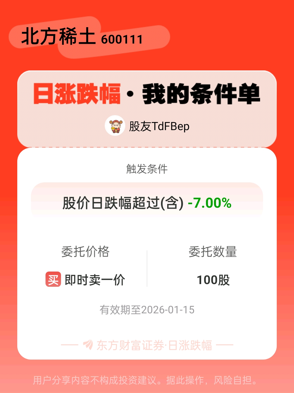 #条件单交流# #日涨跌幅晒单# 一位股神设置了一个日涨跌幅条件单,接下来就是见证奇迹的时刻~$北方稀土(SH600111)$