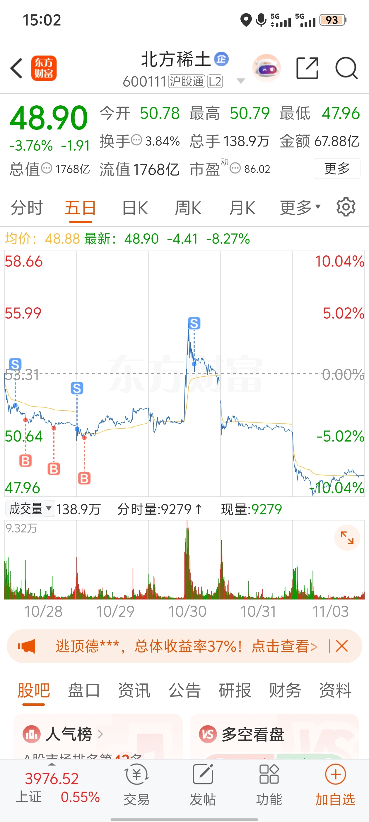 $北方稀土(SH600111)$ 还好上个星期四保本卖了,现在进来看看两天又跌了7个点