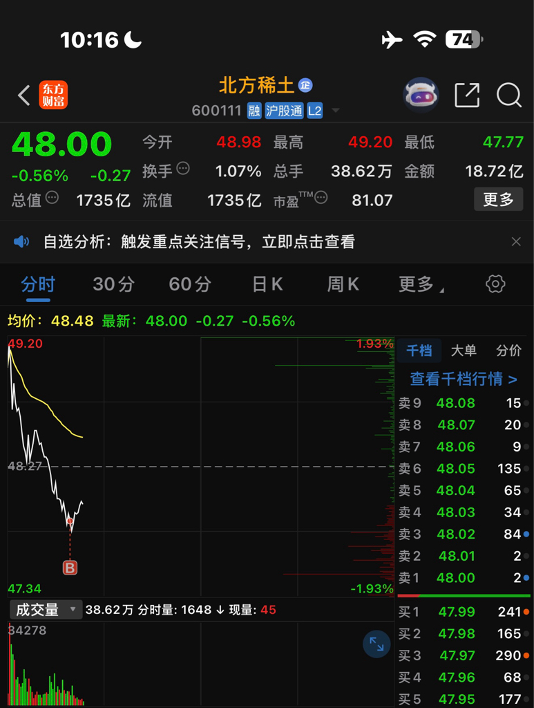 $北方稀土(SH600111)$ 老铁们,47.88,我来接飞刀了,设置45块止损!