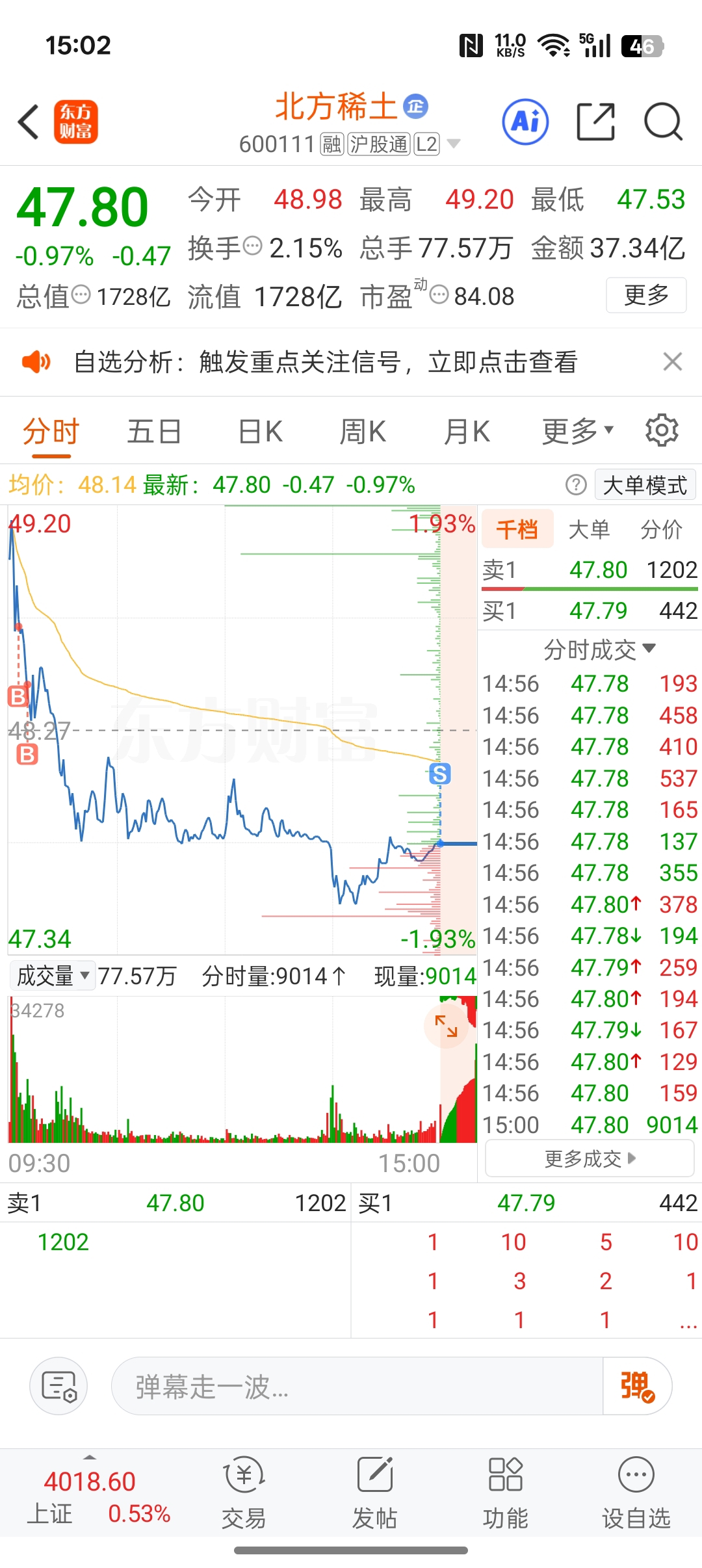 $北方稀土(SH600111)$ 高开没跑还加仓了,SB勾