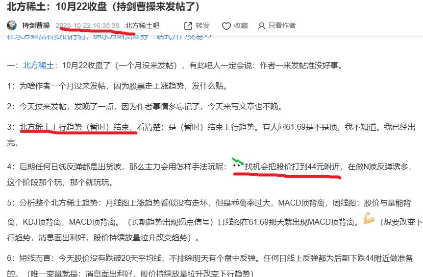 一:北方稀土:10月22文章提示股价有打到44元附近风险,作者一般不来发帖,比如10月22作者看到向下拐点出现,才来情怀一把。(现在论点已证伪,但心情低落,为啥:明明大伙都有机会离开,非要落子无悔)。