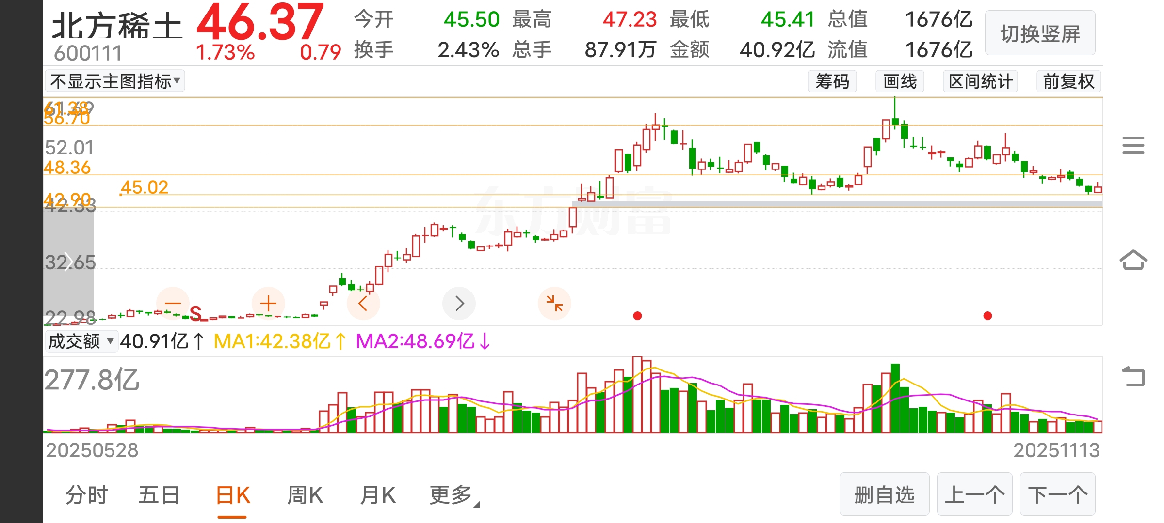 北方稀土:径线45.05,补缺42.9小跌小买,大跌大买,摸盘观望,带量涨停全仓