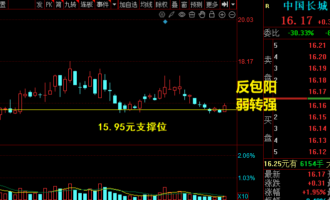 上午盘面10点钟的时候,长城的股价有异动,出现了放量拉升,这是一个典型的主俚行为。股价走出了温和放量的反包阳线,整体趋势由弱转强,目前股价仍在15.95支撑位附近,有苍位的铁子可以逢低布居。