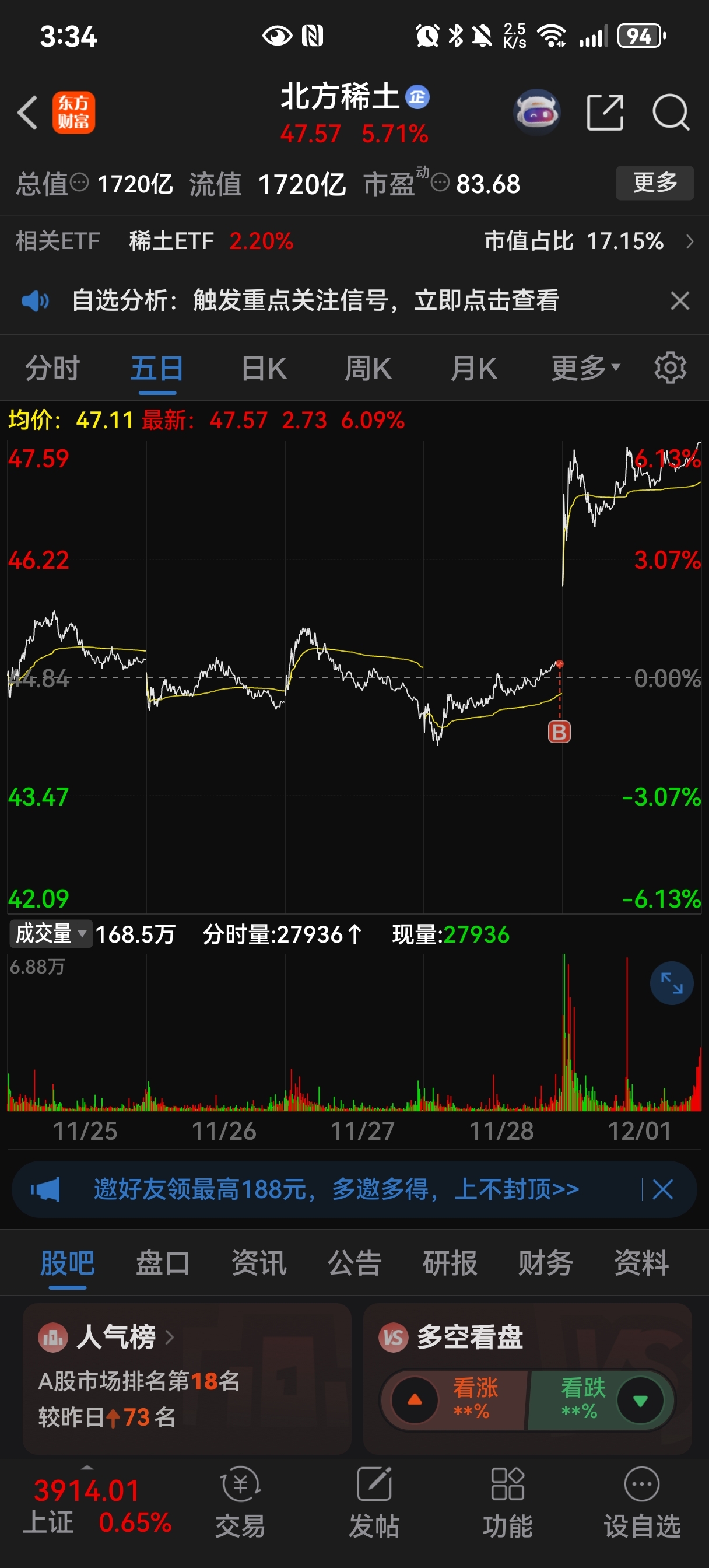 $北方稀土(SH600111)$ 放了点量了