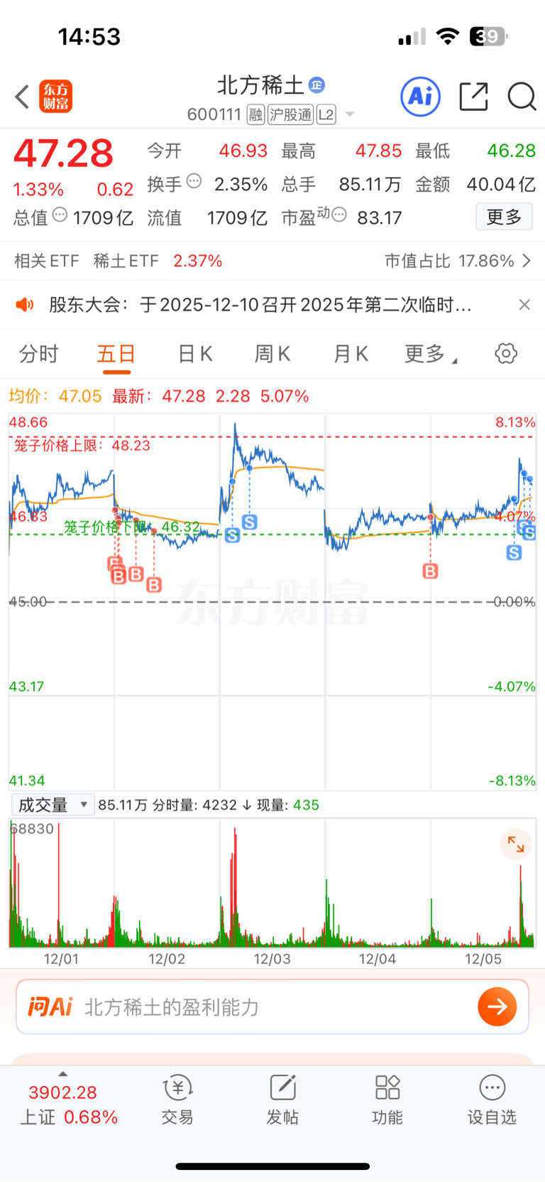 $北方稀土(SH600111)$ 直线拉伸不涨停或者蓄势没有突破,这就是假拉伸假套路,下周必低开建议下周再进,现在清仓离场或者半仓离场