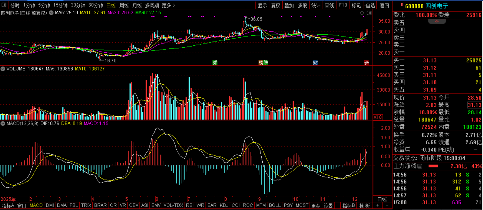 四创电子(SZ600990):低空经济+雷达+商业航天+央企+军工+雷达+可控核聚变+PCB。公司主要从事气象雷达、空管雷达、低空警戒雷达等感知产品业务,印制电路板、微波组件、电源等感知基础业务,安防、应急、军队信息系统集成、粮食信息化等感知应用业务。是近期热点PCB、商业航天以及可控核聚变的综合概念股,目前股价仍处于相对低位,后市随着上述这些题材的持续发酵,估值上修明显。从走势来看,该股上周一放量突破60日均线,这是新趋势即将起来的表征,其后几天震荡整理,上周五再次放量拉涨封板,稳定在近半年来的支撑位,而从盘口数据看,后市继续上涨无忧。预计今日该股有望继续走高,如果后市继续拉涨突破36.85的话,那该的新的上涨空间打开。