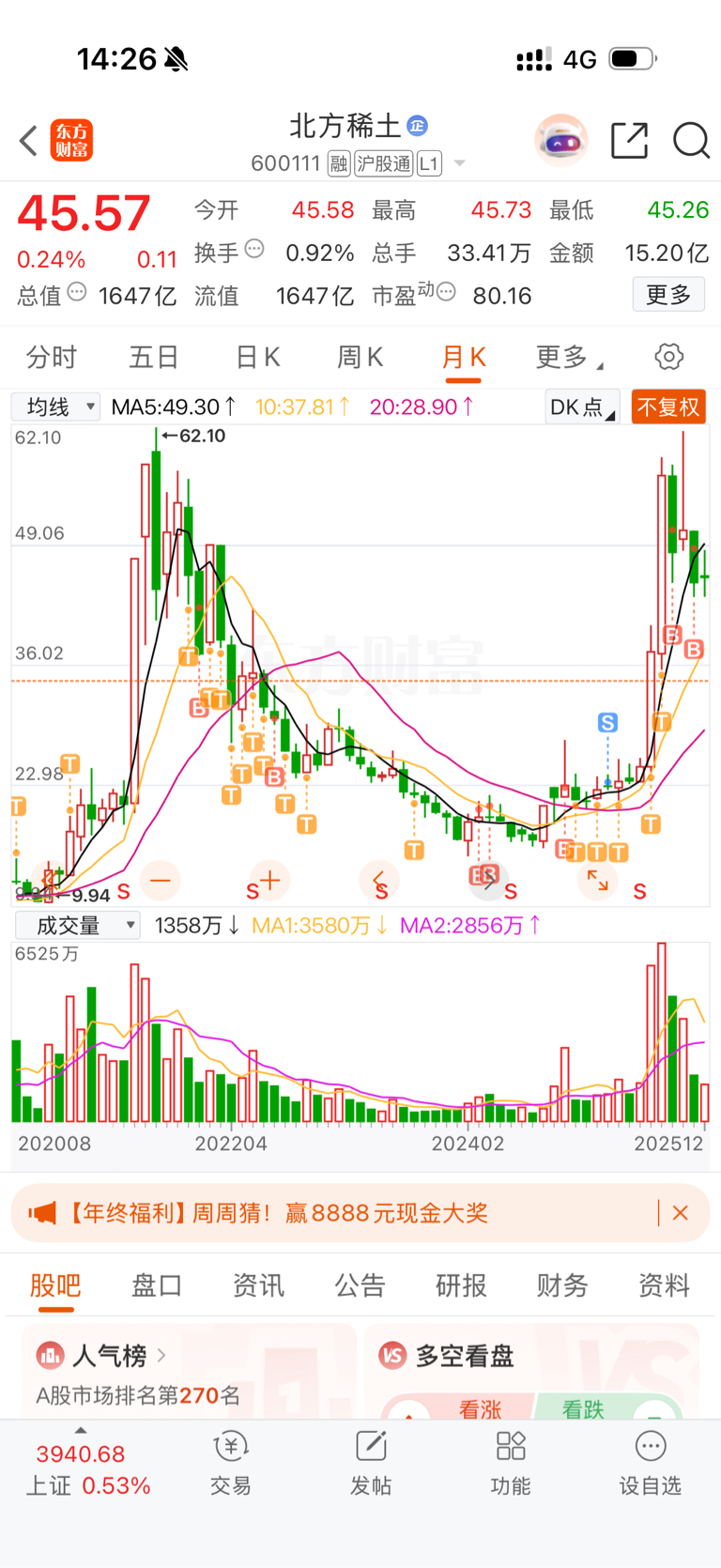 $北方稀土(SH600111)$ 你们才拿几个月 我拿了4年多了 45第一次入 套了就t 坚持到现在 拿着吧待涨