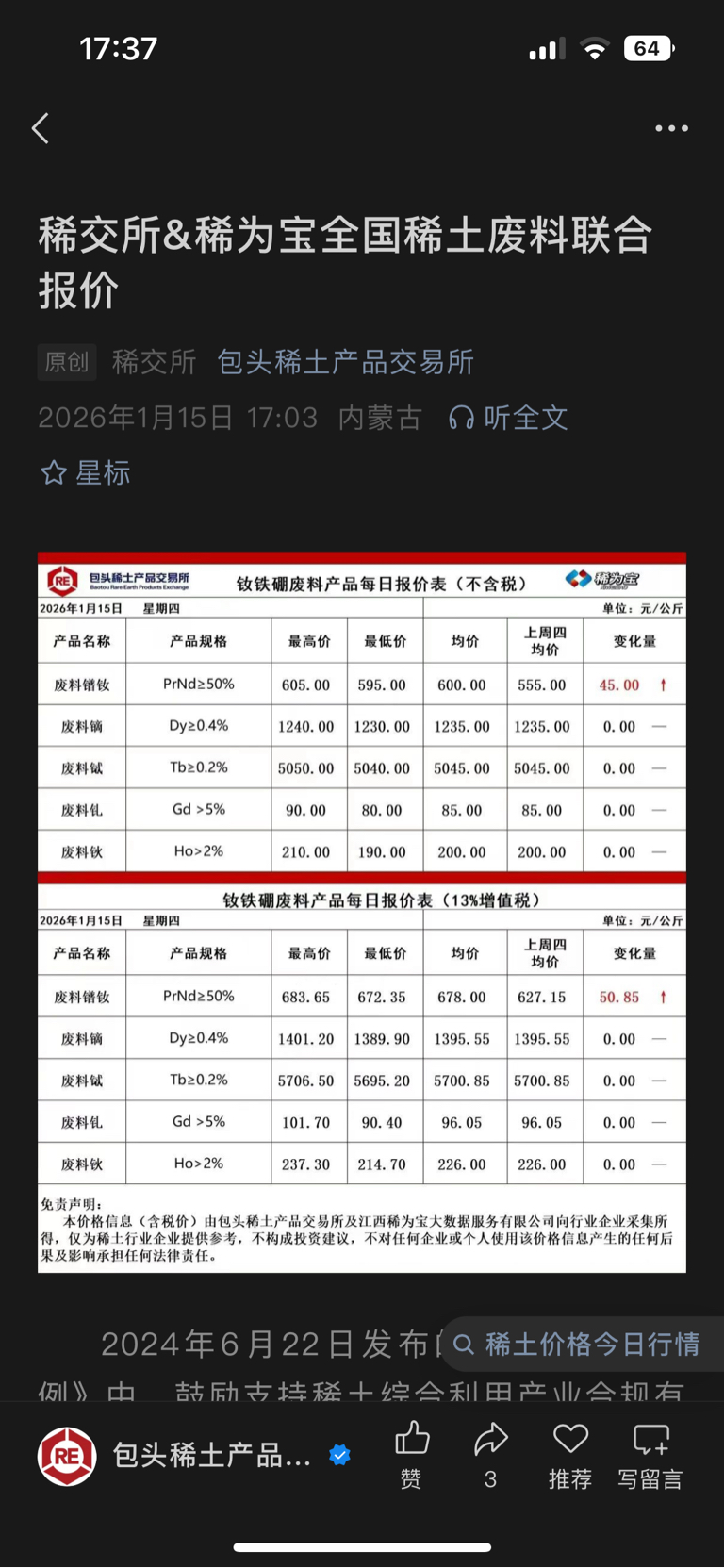 $北方稀土(SH600111)$ 废料都涨价了8%,说明短期稀土产品的价格还会暴涨,就是这个股价太弱了