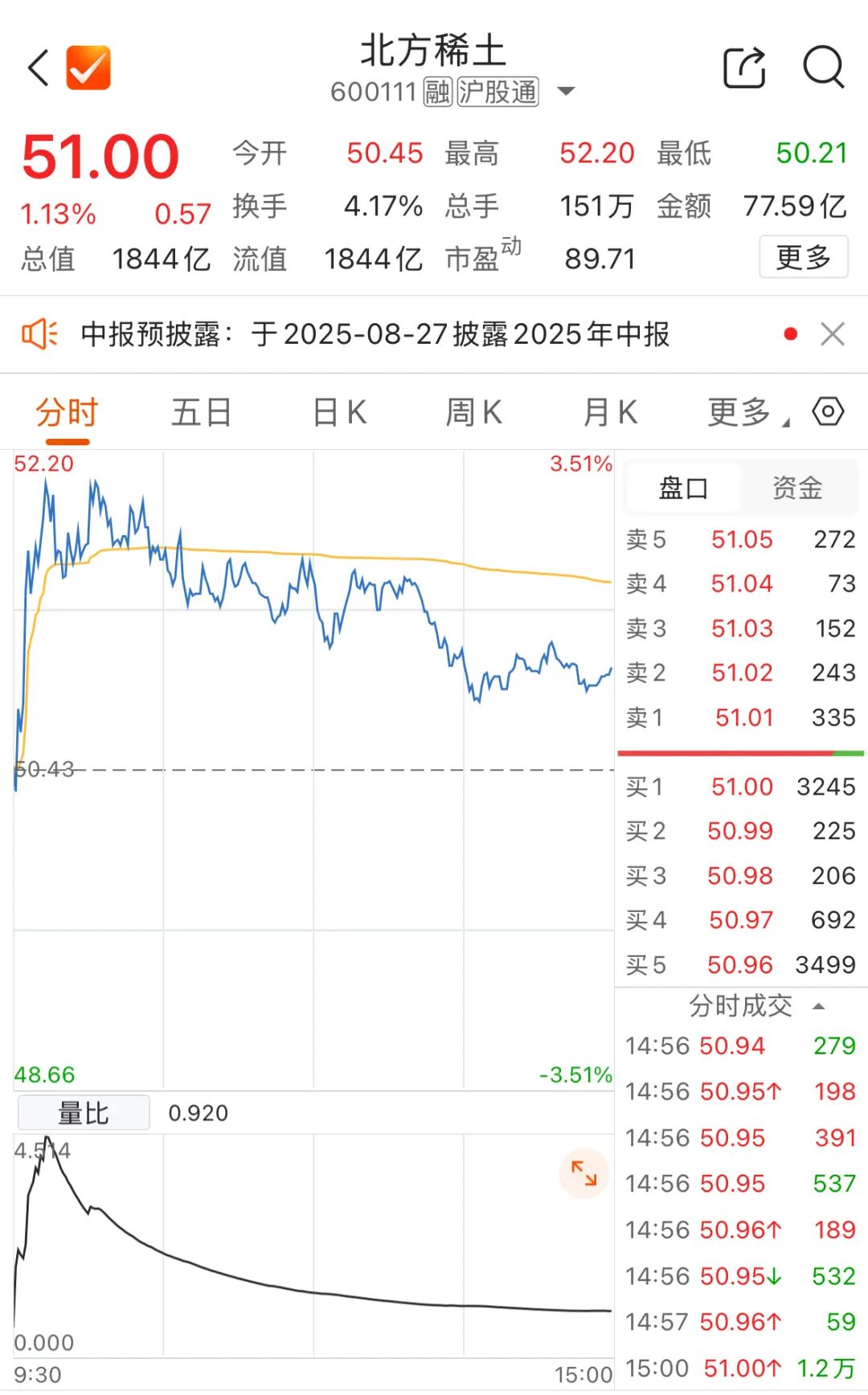 1月16日,北方稀土涨1.13%,报51元/股,市值超1800亿元。