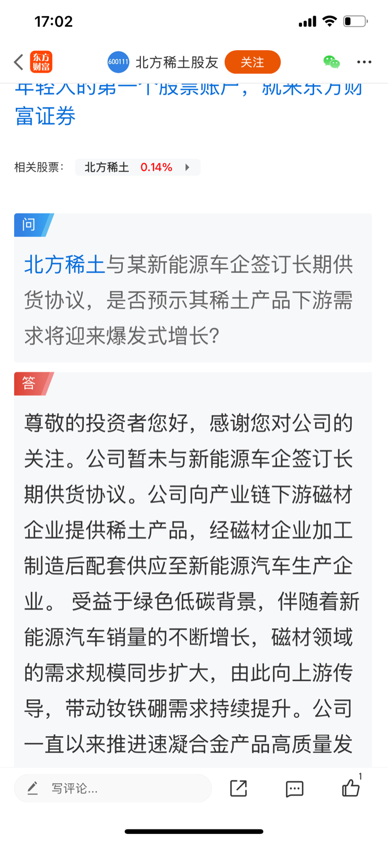 $北方稀土(SH600111)$ 这董秘回复最多的是股东人数多少,今天终于能回复别的了!