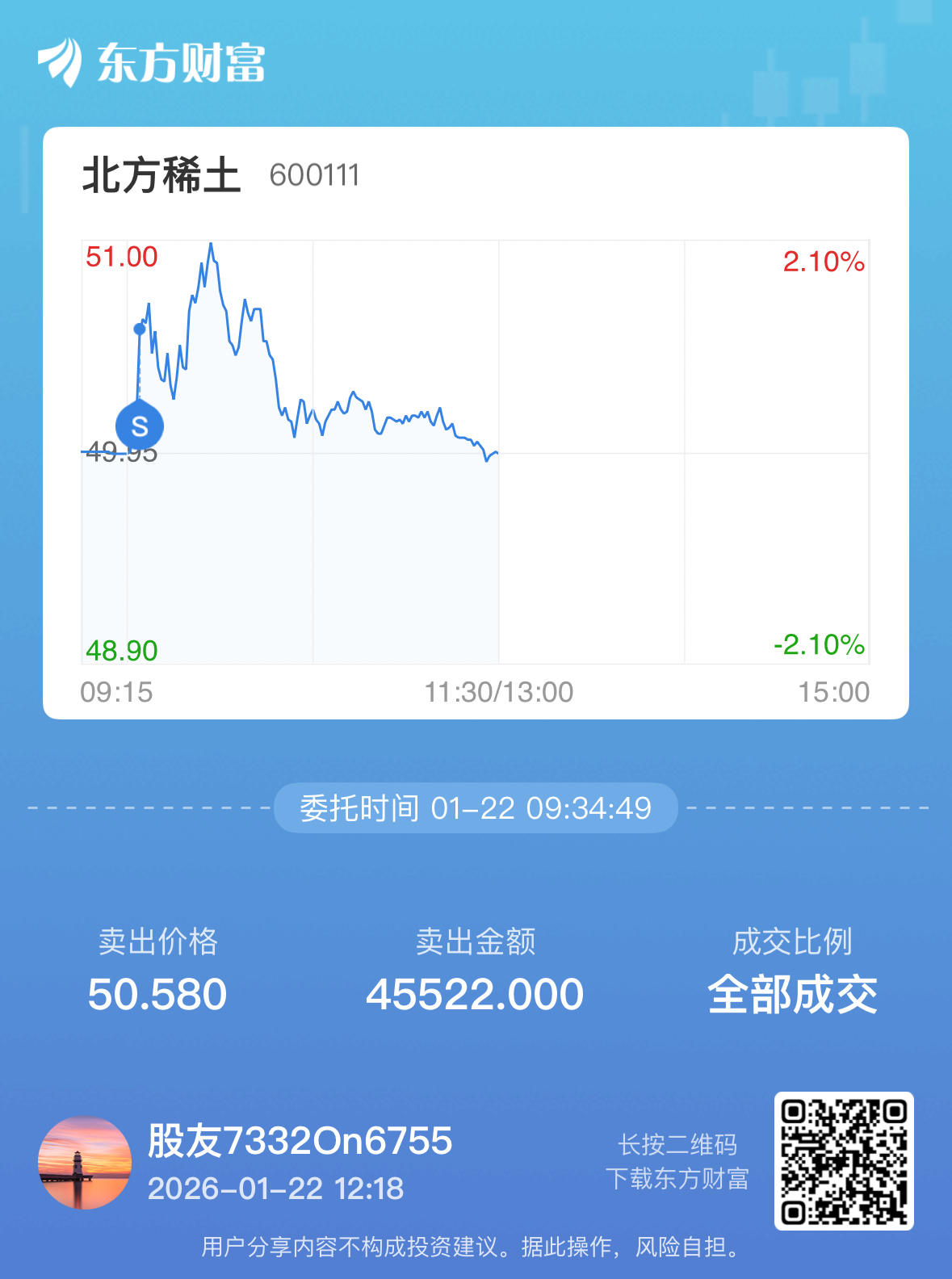 $北方稀土(SH600111)$ 本来还想等再高一点t的,结果忘记关委托单了,少赚几百块