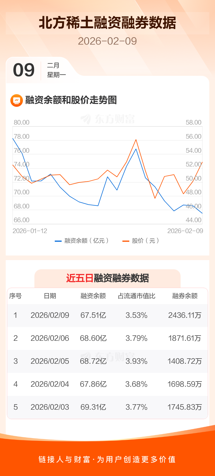 交易所最新数据显示,北方稀土于2026年2月9日获融资买入7.55亿元,融资偿还8.64亿元,当日融资净偿还1.09亿元。目前,该股融资余额67.51亿,占流通市值比例为3.53%。