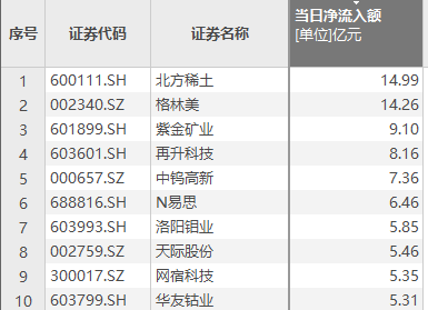 资金风向标 | 北方稀土获资金净流入14.99亿元