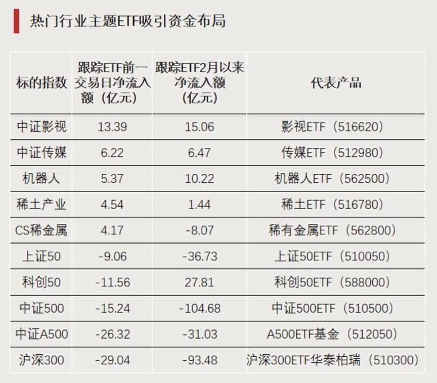 近期热点轮动行情下,场内资金呈现从宽基ETF流向行业主题ETF的趋势。沪深300、中证A500主题ETF昨日均净流出20亿元以上,中证500、科创50主题ETF净流出超10亿元。