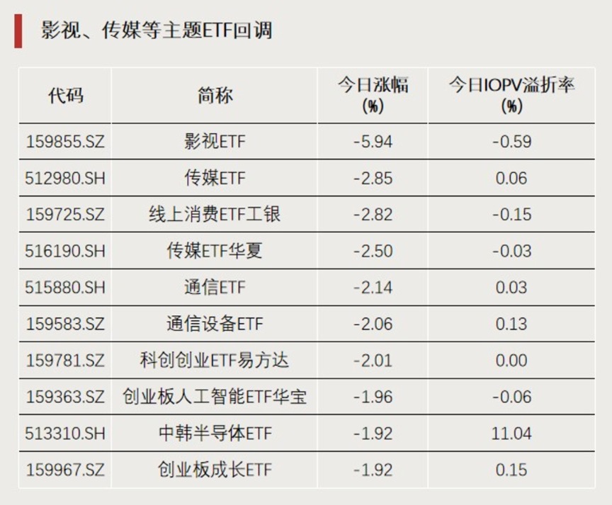 受益于AI应用风口的影视、传媒、线上消费等主题ETF,今日集体回调。昨日涨停的影视ETF(159855)今日跌近6%,昨日涨超4%的传媒ETF(512980)、线上消费ETF工银(159725)等今日跌超2%。
