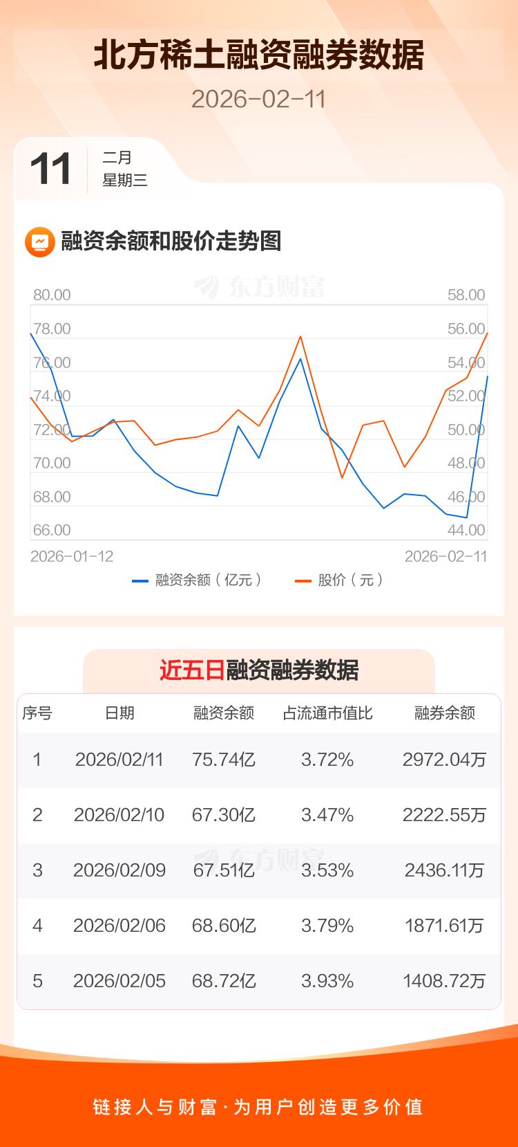 交易所最新数据显示,北方稀土于2026年2月11日获融资买入20.08亿元,融资偿还11.64亿元,当日融资净买入8.44亿元。目前,该股融资余额75.74亿,占流通市值比例为3.72%。