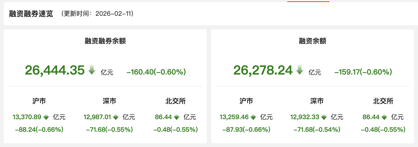上证报中国证券网讯2月11日,A股两融余额为26444.35亿元,较上一交易日减少160.40亿元,占A股流通市值比例为2.54%。当日两融交易额为1806.36亿元,较上一交易日减少120.21亿元,占A股成交额的9.02%。