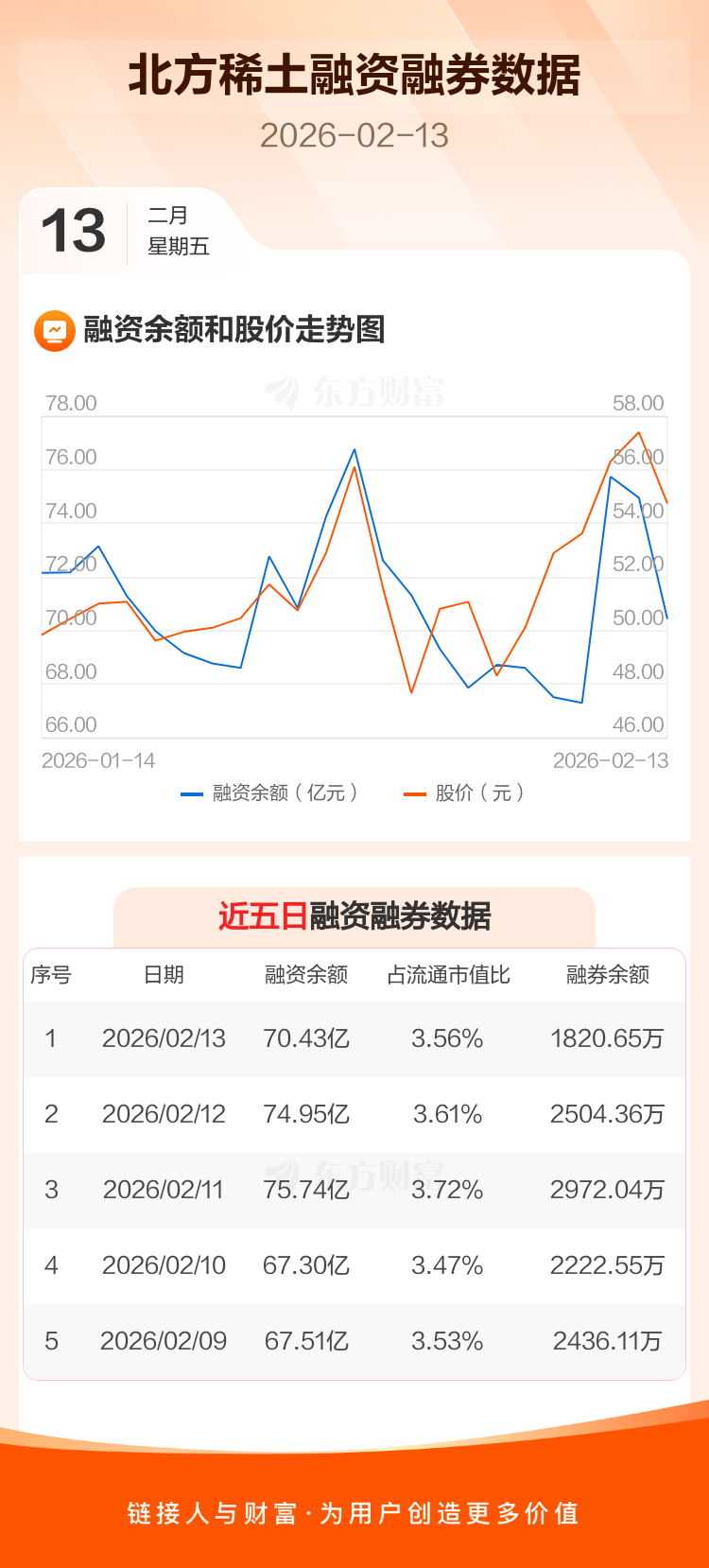 交易所最新数据显示,北方稀土于2026年2月13日获融资买入6.33亿元,融资偿还10.85亿元,当日融资净偿还4.52亿元。目前,该股融资余额70.43亿,占流通市值比例为3.56%。