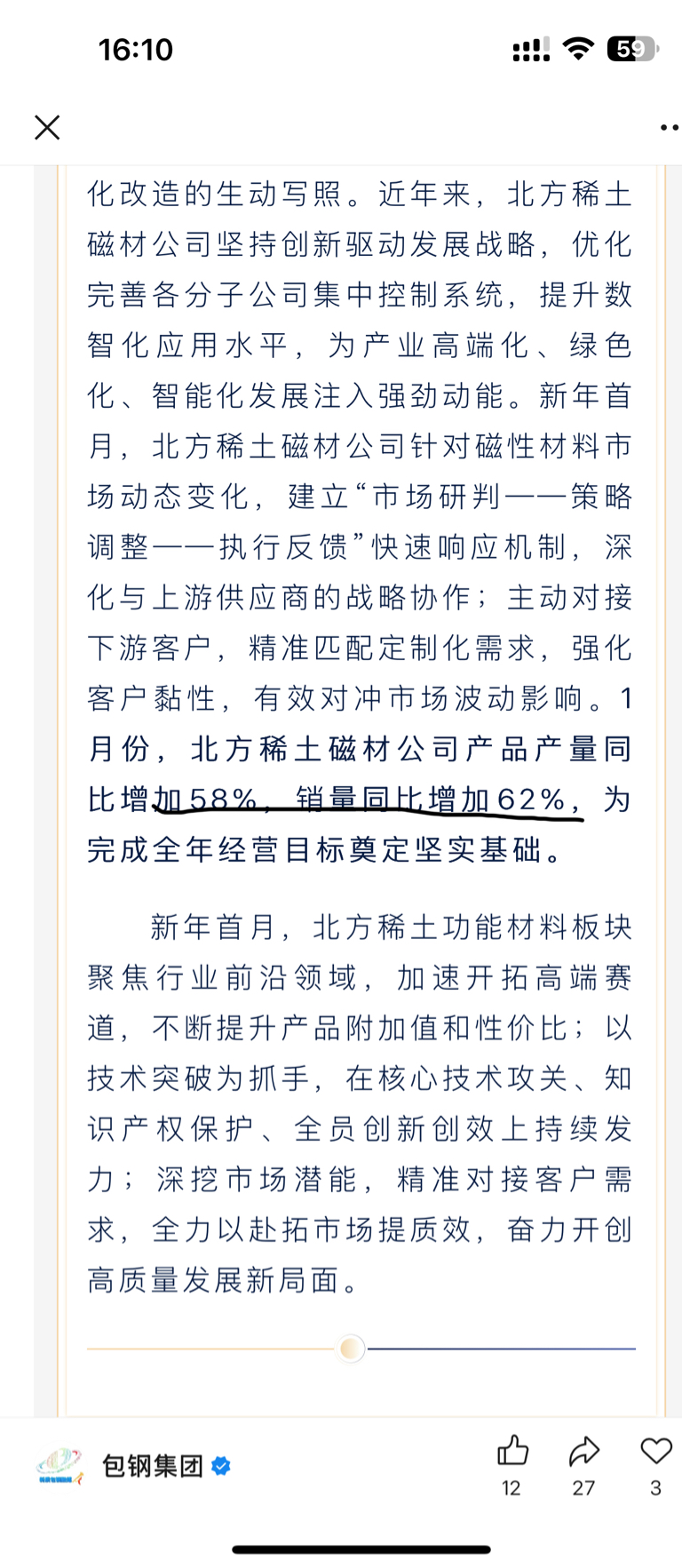 $北方稀土(SH600111)$ 北方稀土磁材一月份销量增长60%,股价在涨60%