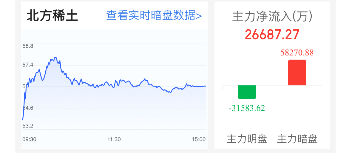 最新数据显示,北方稀土当日主力暗盘资金流入5.83亿元,主力明盘资金流出3.16亿元。明盘资金呈现流出状态,但暗盘资金流入更多,主力整体持仓比例增加,可能存在主力通过拆单等方式进行低吸的情况,资金面呈现结构性分化特征。