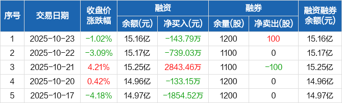 融资方面,当日融资买入1230.16万元,融资偿还1373.96万元,融资净偿还143.79万元。融券方面,融券卖出100股,融券偿还0股,融券余量1200股,融券余额6.04万元。融资融券余额合计15.16亿元。