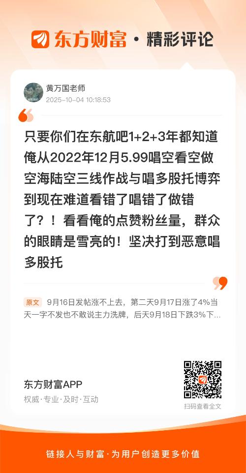 请教大师现在4.15元下个月看空吗?//@黄万国老师 : 只要你们在东航吧1+2+3年都知道俺从2022年12月5.99唱空看空做空海陆空三线作战与唱多股托博弈到现在难道看错了唱错了做错了?!看看俺的点赞粉丝量,群众的眼睛是雪亮的!坚决打到恶意唱多股托