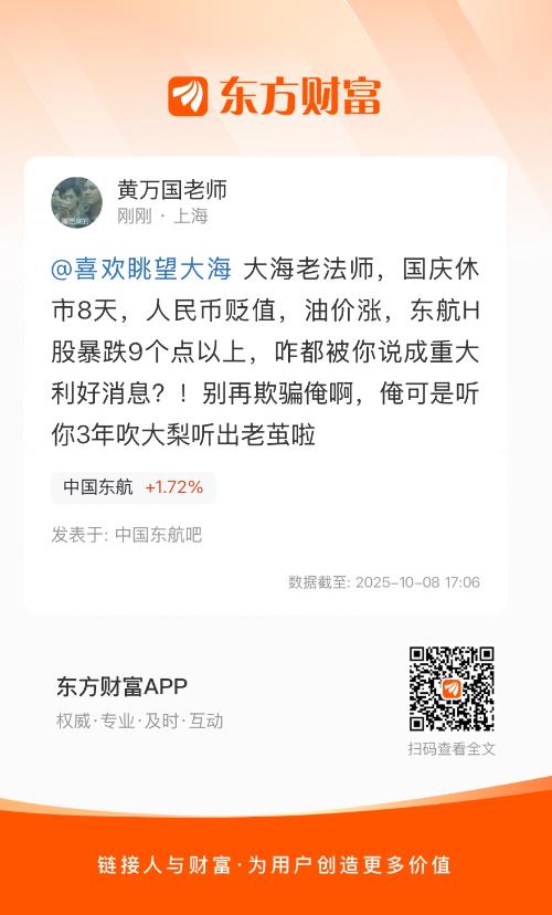 @喜欢眺望大海 大海老法师,国庆休市8天,人民币贬值,油价涨,东航H股暴跌9个点以上,咋都被你说成重大利好消息?!别再欺骗俺啊,俺可是听你3年吹大梨听出老茧啦