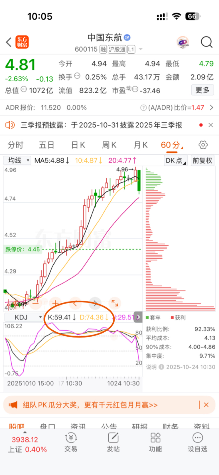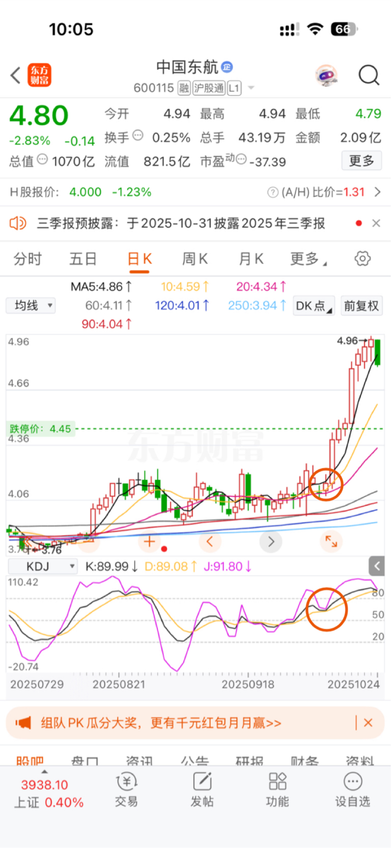 $中国东航(SH600115)$ 先看60分钟KDJ中D减K大于等于20时形成超卖,绝不能慢跌传递到日线,急跌空方超卖力竭!再看日K线KDJ有没有死叉,如果没死叉会像图2圈圈除那样形成空中加油站,这取决于速战速决一定要急跌,不要墨迹。